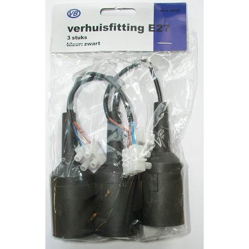 Lamphouder met gemonteerd snoer, ophanghoog/snoerontlasting en kroonsteen. Kan dienst doen als tijdelijke verlichting bij verhuizingen. Geschikt voor lampen met grote fitting. In zakje met 3 stuks.