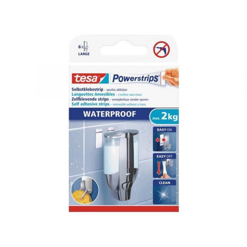 Deze Tesa Powerstrips® Waterproof zijn bruikbaar voor de al reeds aangschafte Tesa Powerstrips producten. De strips zijn uitermate geschikt voor het ophangen van allerlei badkamer -en keukenaccessoires zoals zeepdispensers, bekerhouders en handdoekhaken. Dankzij de innovatieve Tesa Powerstrips® technologie kunnen grotere en kleinere objecten tot 2kg moeiteloos worden vastgemaakt in vochtige, natte ruimtes en later verwijderd worden zonder sporen na te laten. Makkelijk te monteren zonder boren of schroeven dankzij de unieke Tesa® Powerstrips® Waterproof technologie. De strips zijn geschikt voor tegels en glas, zelfs onder de douche (niet geschikt voor geschuimd en poreus materiaal).