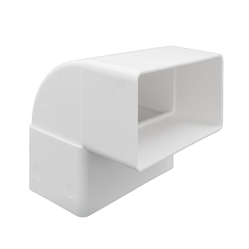 Kunststof ventilatiebuis verticale bocht 90 ° voor rechthoekige buis / vlakkanaal 110 x 54 mm, verbinding met tweezijdige mof, kleur wit.