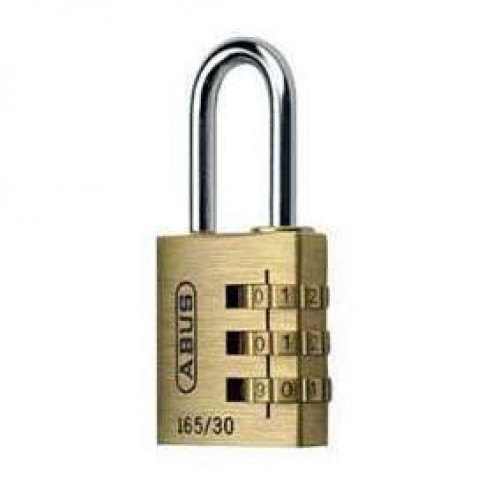 Abus cijfer hangslot 165/30mm. Met enkele vergrendeling. Rechthoekige slotkast van messing. Sluitbeugel van gehard staal, verchroomd. Met persoonlijk instelbare cijfercode d.m.v. 3 cijferrollen.