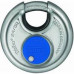 Abus discus-cilinderslot. Ronde slotkast van roestvaststaal, gelast, zonder klinknagels. Cilinder van messing, beschermd door een geharde boor- en trekbeschermingsplaat. Sluitbeugel van gehard gelegeerd staal, vernikkeld. Nauwe beugelopening, zodat moeilijk opgebroken kan worden. Met 2 vernikkelde sleutels.