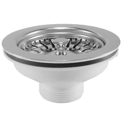 Gootsteen afvoerzeef 1 1/2". Zeefkorfventiel voor aansluiting op spoelbakken. Het onderste deel is gemaakt van wit plastic en het bovenste deel is gemaakt van gepolijst roestvrij staal.