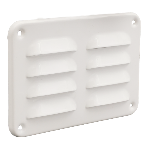 Schoepenrooster wit 130 x 90 mm, vervaardigd van aluminium, met omgezette rand, opbouw.
