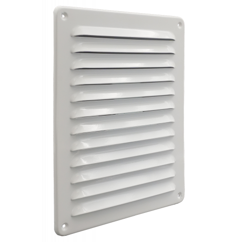 Schoepenrooster wit 245 x 195 mm, vervaardigd van aluminium, met omgezette rand, opbouw.
