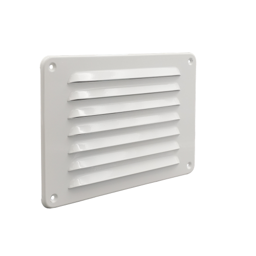 Schoepenrooster wit 215 x150 mm, vervaardigd van aluminium, met omgezette rand, opbouw.