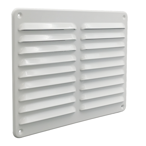 Schoepenrooster wit 245 x 195 mm, vervaardigd van aluminium, met omgezette rand, opbouw.