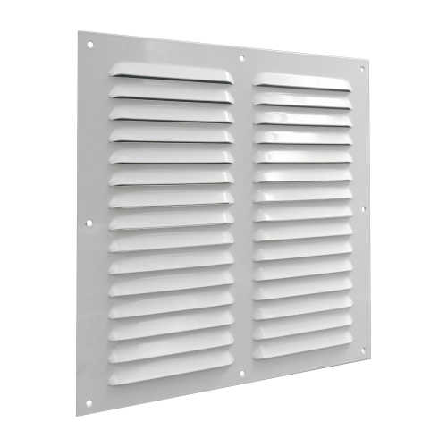 Schoepenrooster wit 300 x 300 mm, vervaardigd van aluminium, vlakke uitvoering, opbouw.