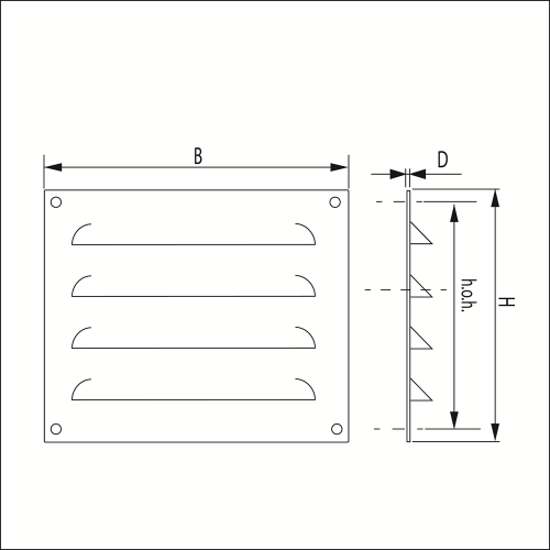 Schoepenrooster met grote schoepen 250 x 200 mm, vervaardigd van aluminium, vlakke uitvoering, opbouw.
