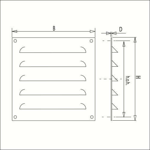 Schoepenrooster met grote schoepen 250 x 250 mm, vervaardigd van aluminium, vlakke uitvoering, opbouw.