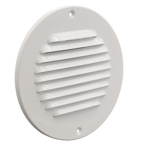 Schoepenrooster wit rond 150 mm, vervaardigd van aluminium, met omgezette rand, opbouwt.