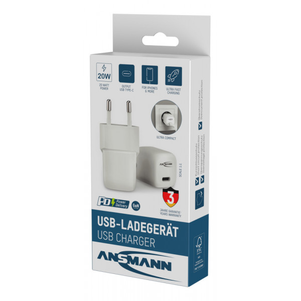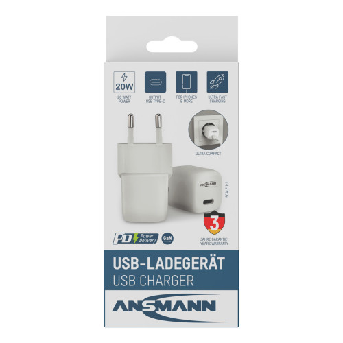 Intelligente Mini-USB-oplader met GaN-technologie en 20 W. Compatibel met Apple iPhone 12 & 13 en heel veel andere smartphones, tablets en andere USB-apparaten