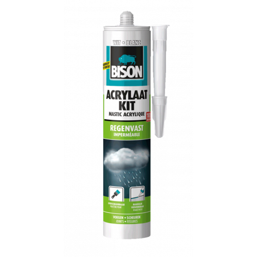 Bison acrylaatkit wit regenvast is een hoogwaardige, gemakkelijk verwerkbare, snel regenvaste plasto-plastische afdichtingskit op acrylaatdispersiebasis voor het afdichten van voegen, naden, kieren en scheuren. Overschilderbaar en strak afmesbaar. Binnen en buiten toepasbaar. (Acrylaatkit is niet geschikt voor blijvend natte plaatsen en voor blijvend elastische afdichtingen. Gebruik hiervoor Bison Siliconenkit).