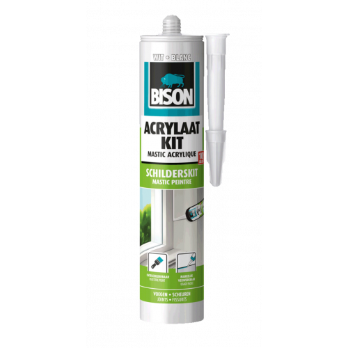 Bison acrylaatkit wit is een hoogwaardige, zeer gemakkelijk verwerkbare, elasto-plastische afdichtingskit op acrylaatdispersiebasis voor het afdichten van voegen, naden, kieren en scheuren. Overschilderbaar en strak afmesbaar. Binnen en buiten toepasbaar. (Acrylaatkit is niet geschikt voor blijvend natte plaatsen en voor blijvend elastische afdichtingen. Gebruik hiervoor Bison Siliconenkit).