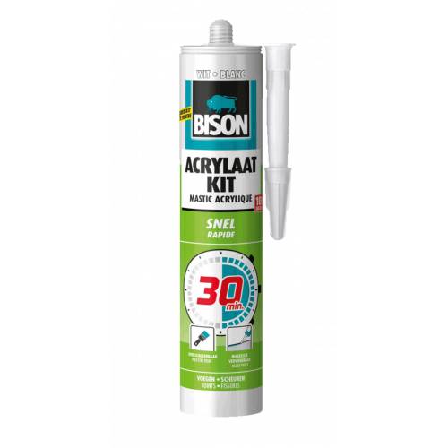 Bison acrylaatkit wit 30 minuten is een hoogwaardige, zeer gemakkelijk verwerkbare, elasto-plastische afdichtingskit op acrylaatdispersiebasis voor het afdichten van voegen, naden, kieren en scheuren. Overschilderbaar en strak afmesbaar. Binnen en buiten toepasbaar. (Acrylaatkit is niet geschikt voor blijvend natte plaatsen en voor blijvend elastische afdichtingen. Gebruik hiervoor Bison Siliconenkit).