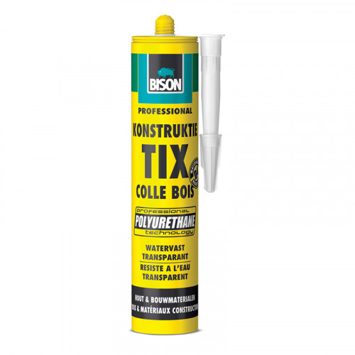 Bison konstruktieTix transparant is een tixotrope watervaste beperkt vullende 1-component polyurethaan bruislijm voor binnen en buiten. Voldoet aan norm NEN-EN 204 D4. Voorzien van KOMO-Certificaat "Lijmen voor niet-dragende toepassingen", Certificaatnummer 32394, toegelaten voor vingerlassen (alle houtsoorten) en geveltimmerwerk (vuren, grenen, meranti en merbau).