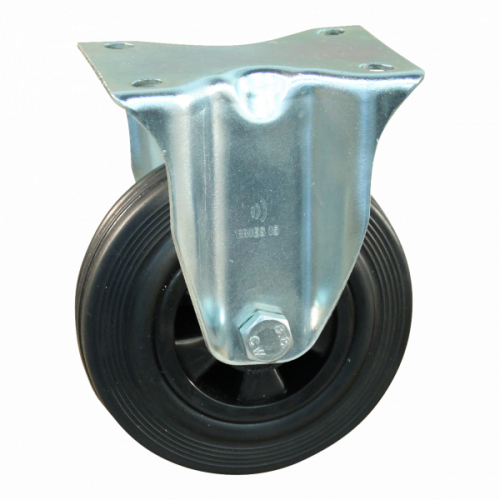Bokwiel 125mm plaatbevestiging, met een zwarte kunststof velg, voorzien van een zwarte standaard rubberen band. Dit wiel heeft een rollager en een maximaal draagvermogen van 100kg.