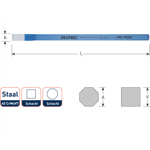 Rotec elektriciensbeitel vierkant 200 x 10 mm. Luchtgehard chroom-molybdeen-vanadium-staal 45 CrMoV7, over de gehele lengte gelijkmatig doorgehard. Slagkop inductief ontlaten, voorkomt versplintering.