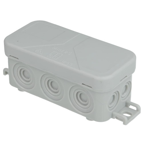 Kabeldoos 43 x 89 x 37 mm, IP 55, getest volgens DIN EN 60670 (VDE 0606), is zeer geschikt voor montage in kleine installatieruimtes met 2 externe bevestigingspunten. 10 voorgestanste ingangen aan de zijkanten en aan de onderkant kunnen nog 2 openeningen worden geboord. De bevestigingspunten zitten aan de buitenkant.