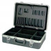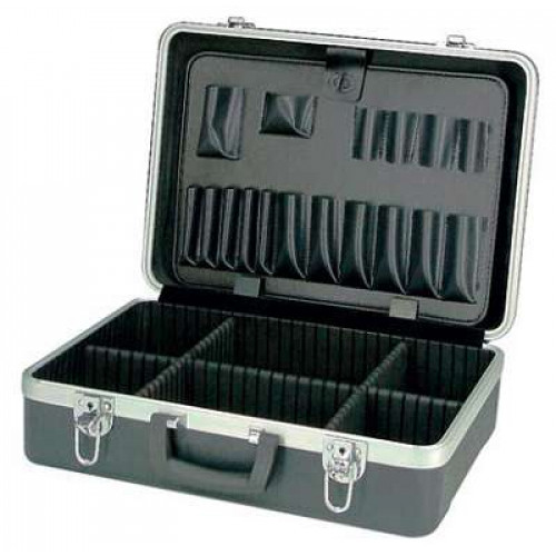 Zwarte ABS / aluminium koffer inclusief enkelzijdig gereedschapsblad met gereedschapshouders en schotten om de koffer naar eigen wens in te delen. De koffer bevat 2 stalen sluitingen en een handvat.