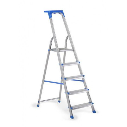 Lichtgewicht huishoudtrap voorzien van handige tooltray met emmerhaak. Belastbaar tot 150 kg. De trap heeft 5 tredes.