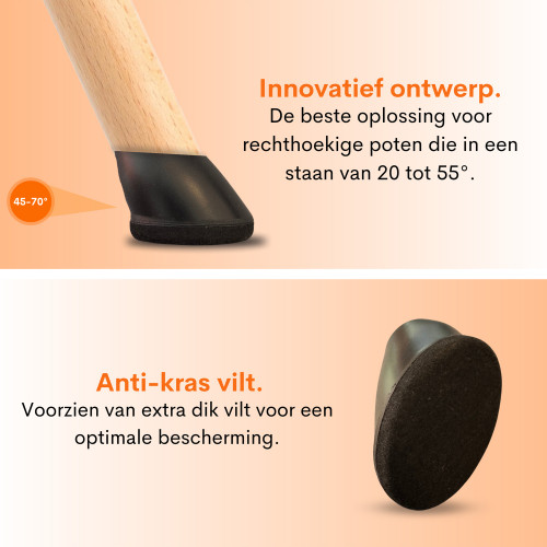 De Premium stoelpootdop van FLOOQ® is gemaakt van 100% massief vilt. Het vilt is gemaakt met hoogwaardige materialen. Als u opzoek bent naar een effectieve stoelpootdop met een lange levensduur en die goed aansluit, dan ben ik de stoelpootbescherming die u moet hebben. Deze variant is geschikt voor rechthoekige stoelpoten met een schuine hoek. Dit product is ontwikkeld met geavanceerde technologie en beschikt over een uniek, gepatenteerd ontwerp. Belangrijk: de stoelpootdop is flexibel. Hierdoor zijn ze ook geschikt voor stoelpoten die 5 mm groter of kleiner zijn dan de aangegeven maten, zowel in de lengte als in de breedte. Met behulp van mij kunt uw stoelen verplaatsen zonder dat deze geluid en/of krassen maken op uw vloer. Deze variant is geschikt voor alle vloertypen binnenshuis. Innovatief en Gepatenteerd Design - Geen geluid van schuivende stoelen - Gemaakt met hoogwaardig vilt - Eenvoudige bevestiging - Geschikt voor alle type vloeren - Stijlvol design