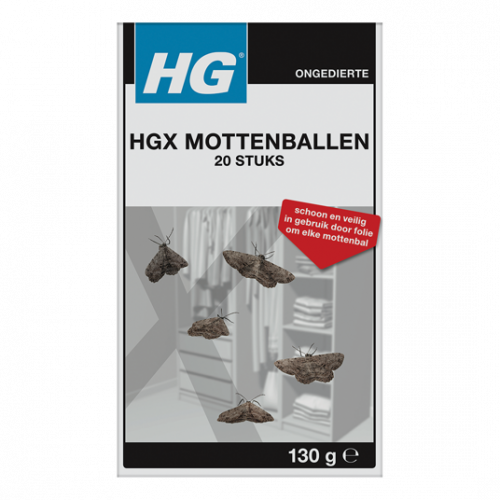 HGX mottenballen zijn de oplossing om eenvoudig nachtvlinders, mottenlarven en motten te bestrijden. Motten en nachtvlinders voeden zichzelf met kleding, waardoor er gaatjes in de kleding ontstaan. De mottenballen voorkomen deze aantasting en beschermen langdurig en effectief kleding in kleerkasten. Naast deze bescherming zijn de mottenballen schoon en veilig in gebruik door de speciale folie die om elke mottenbal zit. Daarnaast hebben de mottenballen een lichte zeepachtige geur die niet in de kleding gaat zitten. In het doosje zitten 20 stuks.