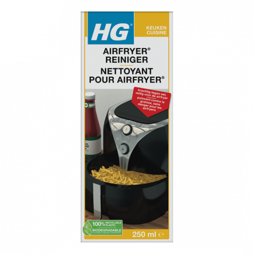 Iedereen die wel eens voedsel in de airfryer heeft bereid, weet hoe makkelijk het is om een lekker gerecht klaar te maken. Maar zo makkelijk als het bereiden is, zo moeilijk (zelfs onmogelijk) is het schoonmaken van de airfryer. Want in de airfryer gebruik je vaak toch een klein beetje olie en komt er, tijdens de verhitting, vet vrij uit het voedsel dat wordt bereid. Samen met voedselresten ontstaat hierdoor, na verloop van tijd, een zeer hardnekkige aanslag. Tot op heden was er geen speciaal product voor het reinigen van de airfryer verkrijgbaar en moesten andere manieren verzonnen worden voor het schoonmaken van de airfryer. Maar deze hardnekkige aanslag van aangekoekt vet en voedselresten is zelfs met het allerbeste afwasmiddel, speciale ontvetters of in de vaatwasser niet te verwijderen. Maar gelukkig is er nu HG airfryer® reiniger: een uniek, gepatenteerd, uiterst krachtig product voor het reinigen van de airfryer. Zeer hard voor de aanslag maar uiterst mild voor de airfryer waardoor deze tijdens het schoonmaken niet wordt aangetast of beschadigd.