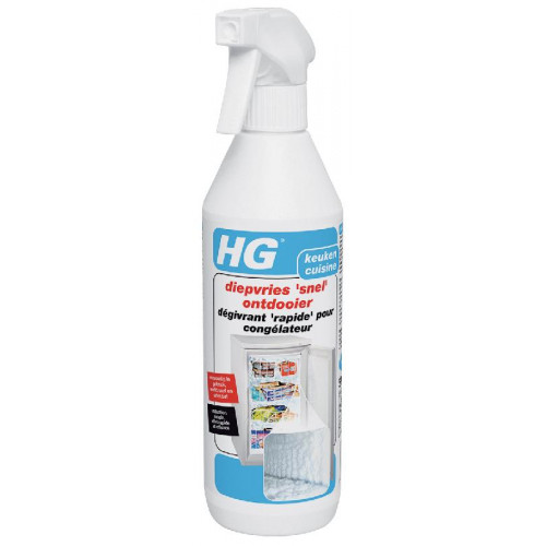 Maak de diepvriezer leeg en verwijder zoveel mogelijk los ijs. Spuit vervolgens het vastzittende ijs gelijkmatig en in ruime mate in met HG diepvries ‘snel’ ontdooier. Enkele minuten laten inwerken en het losgekomen ijs verwijderen. Na het verwijderen van het ijs de wanden van de vriezer droogmaken, waarna de vriezer weer in gebruik kan worden genomen.