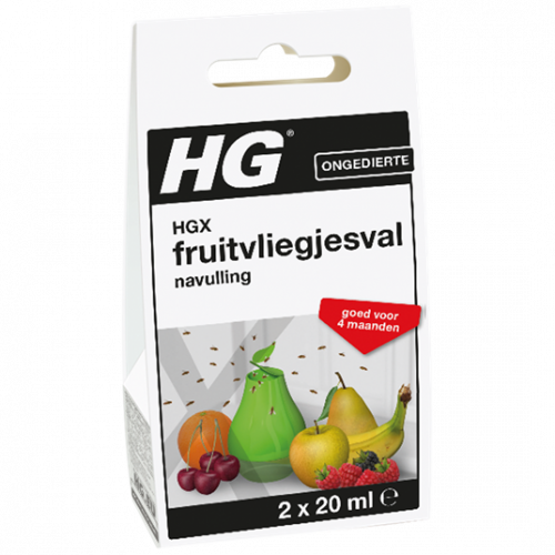 De HGX fruitvliegjesval kan eenvoudig en onbeperkt worden nagevuld met de HGX fruitvliegjesval navulling. Hierin zit een speciale fruitvliegjesval-vloeistof waardoor de fruitvliegjes worden aangetrokken. Eén verpakking HGX fruitvliegjesval navulling bevat 2 navullingen waarmee u de HGX fruitvliegjesval kunt navullen. U heeft dan geen last meer van ongewenste fruitvliegjes in huis.