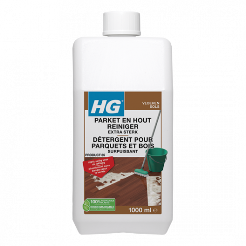 Parket schoonmaken? HG parketreiniger extra sterk is absoluut veilig voor de laklaag van een parket vloer. Deze krachtige reiniger is ook geschikt voor het verwijderen van polish en andere beschermfilms. 1 liter verdund is goed voor ongeveer 25 - 50m2, onverdund 10 – 15 m2.