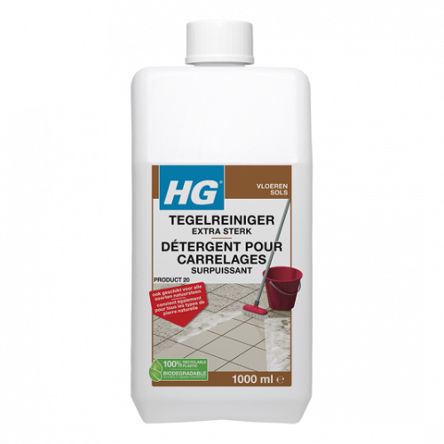 HG tegelreiniger extra sterk (HG product 20) is een professionele, extreem krachtige reiniger voor het verwijderen van echte probleemvervuilingen of zeer moeilijk te verwijderen (oude) was-, polish- en andere beschermfilms op vloertegels, plavuizen en alle soorten natuursteen. Los een halve liter op in een halve emmer (5l) lauw water en breng dit, met behulp van een dweil of mop, in ruime mate aan op het te reinigen oppervlak. Niet meer dan 10 à 15 m2 tegelijk behandelen. Schrob vervolgens het oppervlak goed met een schrobber of borstel, enige minuten laten inwerken en aansluitend nog een keer goed schrobben. Hierna de oplossing van het oppervlak verwijderen met behulp van een dweil. Aansluitend de vloer nog goed nadweilen met schoon water. 1 liter is goed voor wel 35 – 100 m² vloeroppervlak, afhankelijk van de graad van vervuiling.