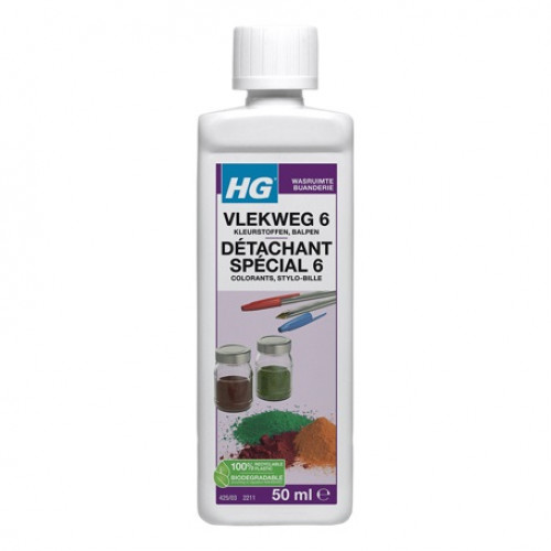 HG vlekweg 6 verwijdert vlekken uit textiel van ballpoint, hardnekkige kleurstoffen, maar ook bier en likeur. HG vlekweg 6 is één van onze 7 speciale HG vlekken verwijderaar producten.