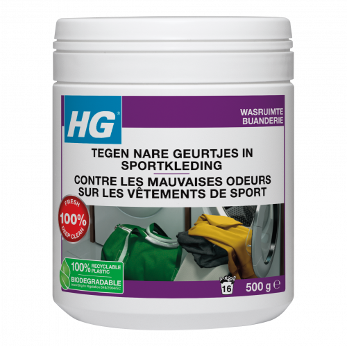 Een hoofdwasmiddel verwijdert nare geurtjes in sportkleding vaak niet. Als kleding wordt gestreken of gedragen is deze geur weer waarneembaar. HG tegen nare geurtjes in sportkleding verwijdert deze geur wel effectief. Ook geschikt voor het ontgeuren van handdoeken en goed voor ongeveer 16 wasbeurten.