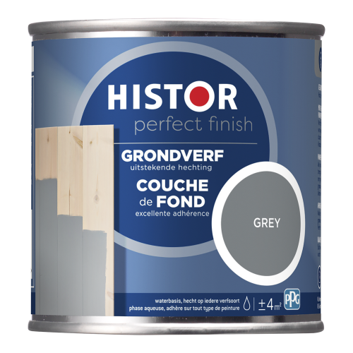 Histor Perfect Finish Grondverf is geschikt voor hout, metaal en kunststof. De grondverf is op waterbasis, maar kan over elke verfsoort heen, ook over terpentineverf. De grondverf zorgt voor een goede hechting, is optimaal dekkend en geurarm. De verf is makkelijk aan te brengen en is sneldrogend. Na 1 uur is de verf stofdroog en na 5 uur overschilderbaar. Standaard is Histor Perfect Finish Grondverf beschikbaar in wit en grijs, maar is ook in iedere gewenste kleur te mengen bij de verfmengbalie. Uitstekende hecting, optimale dekking, sneldrogend