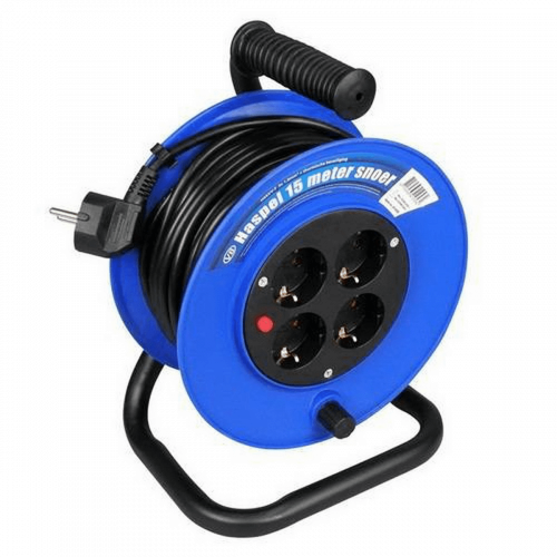 Mini kabelhaspel met 15 meter vinyl kabel 3x1mm en 4 stopcontacten met thermische beveiliging.