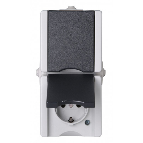 Kopp Pro Aqua spatwaterdicht, tweepolig dubbel stopcontact met randaarde en klapdeksels; voor verticale montage. Aansluiting 16 Ampère, 250 Volt. Beschermingsklasse IP44, d.w.z. spatwaterdichte uitvoering, waardoor geschikt voor toepassing buiten. CE-keur.