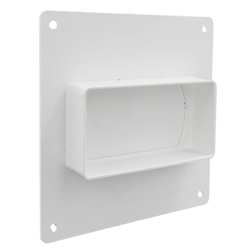 Kunststof montageplaat 168 x 168 mm met terugslagklep 150 x 75 mm voor P.V.C vlak kanaal buis, kleur wit. Muurzijde naar ronde buis 125 mm.