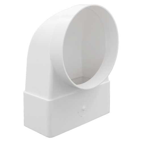 Kunststof bochtstuk met verloop van rechthoekige buis / vlakkanaal 110 x 55 mm naar ronde buis 100 mm, voor verticale hoekverbinding, kleur wit.