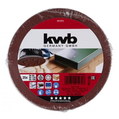 KWB assorrtiment van 25 zelfhechtende schuurschijven, hout & metaal, Ø 125 mm, Edelkorund, met aluminiumoxide bestrooid, gebonden met volledig synthetisch hars, versterkt dragermateriaal, met velours rug, geperforeerd, voor excentrische schuurmachines 125mm met stofafzuiging. Voor het schuren van metaal, hout, verf, lak, plamuur, steen en kunststof.