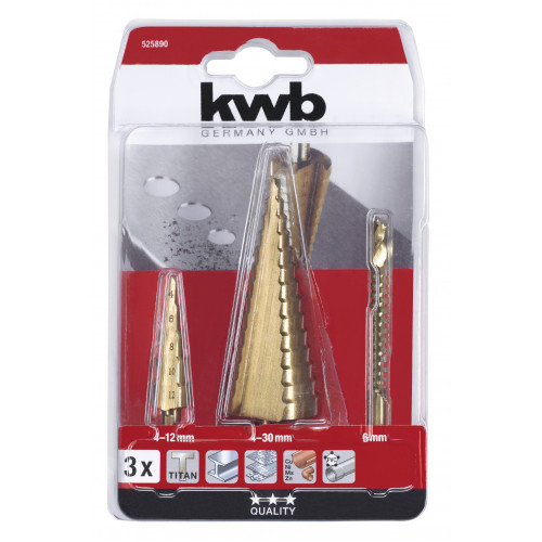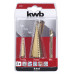 KWB 3-delige set trappenboren, HSS met aanboorpunt, voor het boren van kleine tot grote gaten zonder voorboren in de dunste platen, geen bramen dankzij de afkanter, geen koudlassen, getrapt volgens de meest gangbare boordiameters, voor plaatstaal, non-ferrometalen en kunststof.