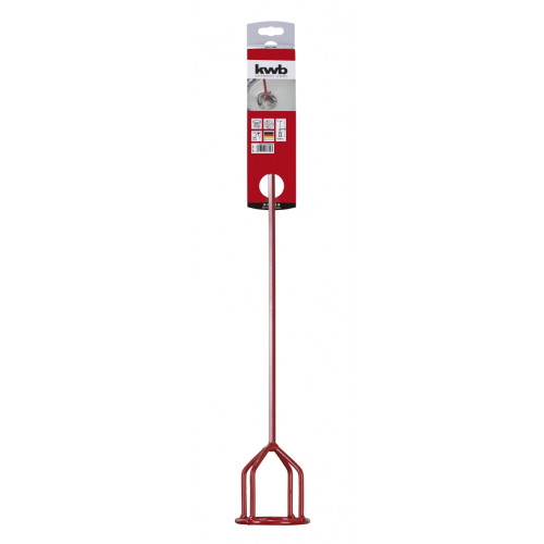 KWB menger voor lijm, metalen garde. Voor het mengen van oppervlaktelijm, plamuur, tegellijm, pleister en ondervloermortel, robuuste uitvoering, zeer rustige loop, met kunststof coating, laat geen verf los tijdens het gebruik, voor gebruik met alle normaal verkrijgbare boormachines, minimaal 500 watt vermogen, zorgt voor een homogene vermenging, energiezuinig door de ronde stalen staaf.