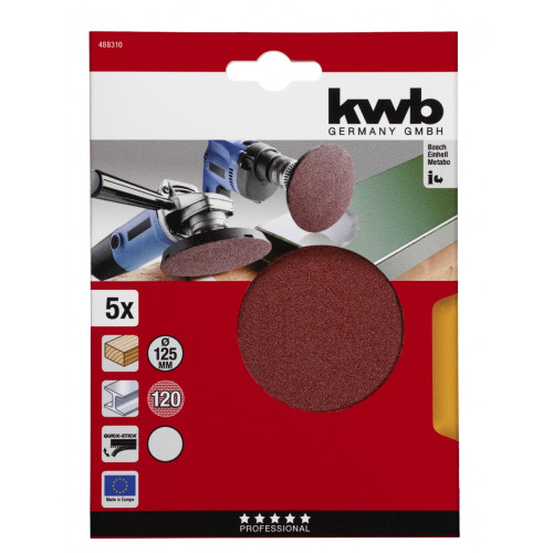 KWB 5x schuurpapierschijven, Ø 125 mm, edelkorund K120, met aluminiumoxide bestrooid, gebonden met volledig synthetisch hars, versterkt dragermateriaal, met velours rug, voor gebruik op hechtsteunschijven met klittenband, voor het schuren van metaal, hout, verf, lak, plamuur, steen en kunststof.
