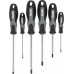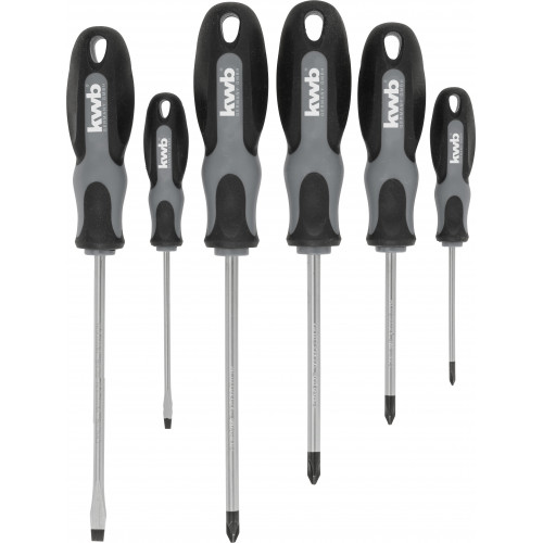 KWB Schroevendraaier set, 6-delig -- Klingen van chroom-vanadium-staal mat, met ergonomische 2-componenten handgrepen voor een hogekrachtoverbrenging en ophanggat in de handgreep. Met magnetische punten opdat de schroeven tegengehoudenkunnen worden en bij de montage er niet afvallen. Extra geharde punten voor een lange levensduur.
