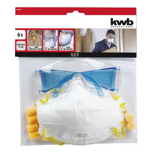 KWB 6-delige veiligheidsset. Met 3 paar wegwerpoordopjes (SNR-waarde: 27 dB), volledig transparante veiligheidsbril van polycarbonaat, met zij- en wenkbrauw- bescherming, ook geschikt voor brildragers, 2 fijnstofmaskers FFP1, bescherming tegen vaste en waterige deeltjes