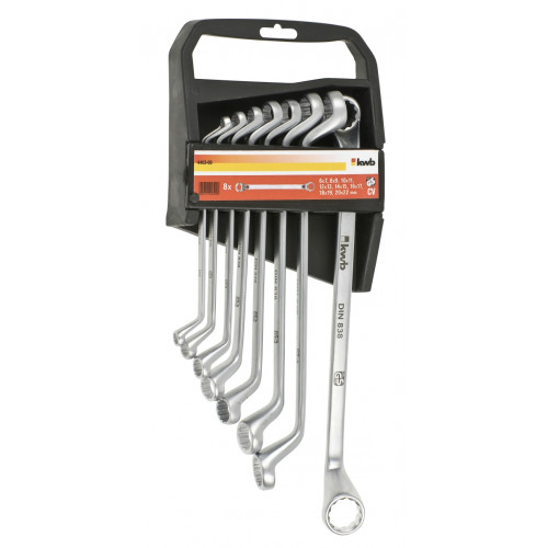 KWB 8-delige ringsleutelset voor werkzaamheden met zeskant- en vierkantschroeven of -moeren. TÜV Rheinland/GS-gekeurd, DIN 838, Chroom-Vanadium staal. VPA GS getest. Satijnen finish, koppen gepolijst. Inhoud: 6+7, 8+9, 10+11, 12+13, 14+15, 16+17, 18+19 en 20+22 mm.