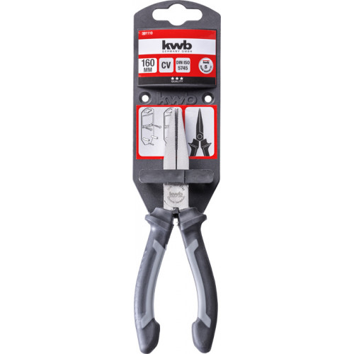 KWB platte tang 160mm, vorm volgens ISO 5745, met lange bek, CV-staal, satijnmatte afwerking, ingelegd scharnier, fijn getande grijpvlakken, 2 componentengreep voor een optimale krachtoverdracht en meer comfort tijdens het werken, voor het vastgrijpen en vasthouden van werkstukken, het vasthouden van spijkers en het ombuigen van draad.
