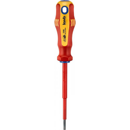 KWB VDE-gekeurde schroevendraaier, geïsoleerd, 3.5 x100 mm, CV-staal, 3 componentenheft voor een optimale krachtoverdracht en veel grip tijdens het werken, steel compleet geïsoleerd, met gebruineerde precisiekop. Een snel herkenbaar kleurcodesysteem geeft de gewenste kopvorm aan.