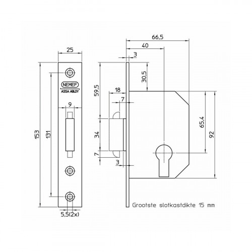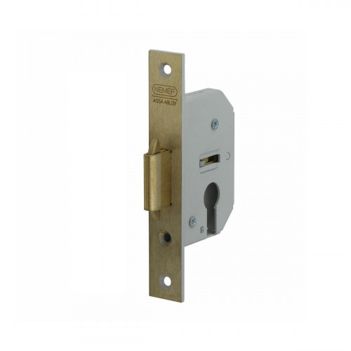 Nemef insteek schuifdeurslot 608/5 40mm, geschikt voor profielcilinder. Dit slot is voorzien van een 1-toers messing nachtschoot met vleugels. Dit slot is voor zowel links- als rechtssluitende schuifdeuren geschikt. De slotkast is staal gelakt met een rechthoekige messing voorplaat.