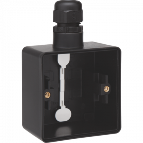 Spuitwaterdichte zwarte Niko opbouwdoos met één M20-ingang met wartel voor het inbouwen van één functie. De bevestigingspunten bevinden zich 50 mm uit elkaar op een verticale as. Deze maataanduiding bevindt zich onuitwisbaar op de bodem van elke doos. De ovale schroefopeningen laten toe een onnauwkeurige boring op te vangen. Een afdichting waarborgt, door een persborging, de beschermingsgraad en de dubbele isolatie. De doos beschikt over twee diagonaal uitbreekbare condensatieopeningen. De opbouwdoos is vervaardigd uit slagvast, stofwerend, halogeenvrij en zelfdovend polypropyleen.
