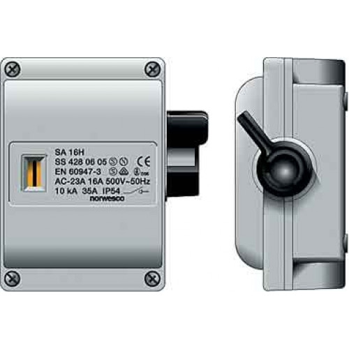 Norwesco werkschakelaar 4-polig 16A, met een behuizing van gerecycled slagvast polucarbonanaat, geschikt voor wandmontage. Werkschakelaar voor het afschakelen van de spanning van machines en locaties. Door de hendel aan de zijkant te plaatsen, is de behuizing uitzonderlijk plat en kan deze in de kleinste ruimtes worden toegepast. De SA serie biedt een beschermingsgraad van IP54. Voor extra veiligheid kan men ze voorzien van een hangslotvergrendeling, om tijdens onderhoud aan airco, zonnepanelen of andere installaties veilig te kunnen werken.